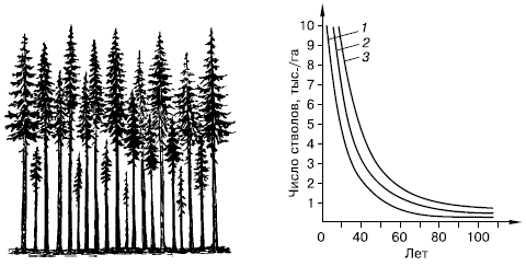 слева – господствующие и угнетенные деревья в ельнике; справа – ход изреживания стволов с возрастом у сосны (1), березы (2) и ели (3)