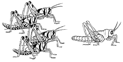 Другой механизм ограничения численности популяций – такие изменения физиологии и поведения при увеличении плотности, которые в конечном счете приводят к проявлению инстинктов массовой миграции. В результате происходит выселение большей части популяции за пределы территории, занимаемой в оседлый период. Особенно ярко это проявляется у насекомых, которым свойственна фазовость – резкое изменение морфологии и физиологии особей в зависимости от плотности популяции (рис. 131). У перелетной саранчи-шистоцерки в постоянных очагах ее обитания в Индии, Пакистане, Восточной Африке и Аравии при низкой численности личинки одиночной фазы имеют ярко-зеленую, а взрослые – серовато-зеленую или бурую окраску. В годы массового размножения, которое наступает при благоприятном сочетании погодных условий, саранча переходит в стадную фазу. Личинки приобретают ярко-желтую, с черными пятнами окраску, взрослая неполовозрелая шистоцерка интенсивно розово-лиловая, половозрелая – лимонно-желтая. Изменяется и морфология особей: удлиняются надкрылья, меняются формы переднеспинки, киля, пропорции конечностей и т. п. Переход из одной фазы в другую занимает около трех поколений. Процесс стимулируется зрительным восприятием особой своего вида и контактами при помощи усиков. Это вызывает в организме насекомых целую серию реакций, приводящих к гормональным перестройкам, в которых участвуют эндокринные железы.