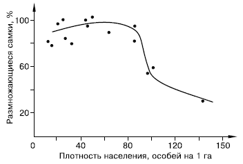 Рис. 133. Зависимость интенсивности размножения от плотности населения в популяции малого суслика (по М. Р. Магомедову, 1995)