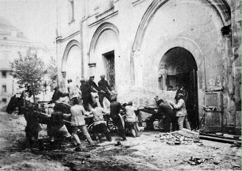 Перенесение останков великих княгинь и цариц перед разрушением Вознесенского монастыря. Фото 1929 г.