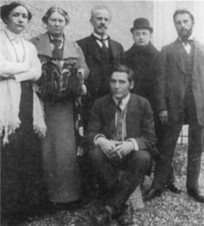 Друзья и участники «Синего всадника». Слева направо: Г. Мюнтер, М. Марк, Б. Кёлер, Ф. Гартман, Г. Кампендонк; сидит: Ф. Марк. Мюнхен, 1912.
