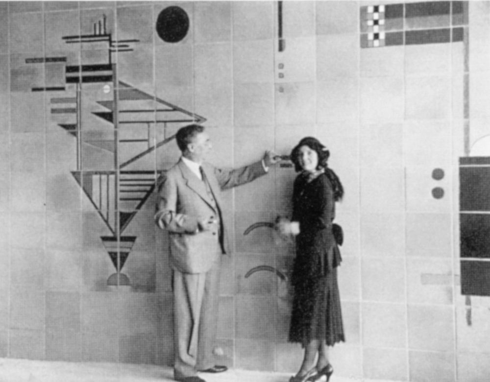 Кандинские в «Музыкальном салоне» на фоне керамической стены по рисунку художника. Германская строительная выставка. Берлин, 1931.