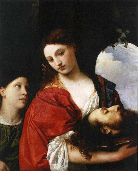 Внимательные исследователи учли, что никаких признаков роскоши в одеяниях не заметно, девушка рядом с главной героиней (первоначально предполагаемой правительницей Иродиадой) не похожа на Саломею, а если считать, что в центре – сама Саломея, то непонятно ее отрешенное спокойствие. Библейская героиня Юдифь с головой вражеского военачальника на подносе, по преданию, могла быть со своей служанкой. Обычно в искусстве Возрождения эта тема символизировала гражданскую доблесть. В пользу такой трактовки говорит и то, что в инвентарной записи коллекции Альфонсо I д'Эсте от 1533 значится картина Тициана «Юдифь». Именно этот факт является лучшим указанием, как следует интерпретировать сюжет данного холста, принадлежавшего внучке Альфонсо – Лукреции.