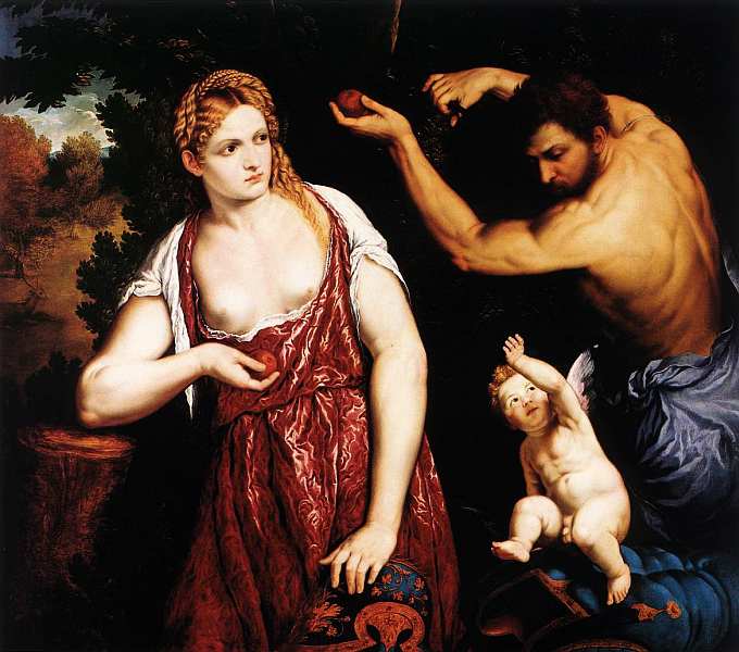 Есть еще один смысл в этих атрибутах – Венера с гранатом в правой руке и со шлемом – в левой олицетворяет победу. И здесь она странно сосредоточена, опершись о пень, чуть отвлекаясь от мускулистой фигуры загорелого Марса. Он уже разоружен и освобожден от металлических воинских доспехов, на которых забавляется малыш Купидон – жестокий сын Венеры. В пейзаже на заднем плане – олень, символ благородства, учтивости, благоразумия, а еще – эмблема французского королевского дома. Так зритель может увидеть за мифологическим сюжетом аллегорическую программу – победу любви и красоты, одолевающих военную силу.