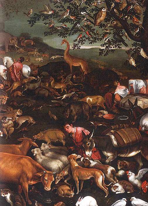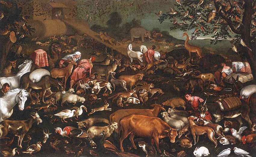 Уникальная картина, демонстрирующая беспрецедентное скопление зверей всех пород и семейств, мирно устремленных в спасительный ковчег, построенный праотцом Ноем перед потопом, приписывается Бассано или его школе. Это естественно, поскольку Якопо да Понте не только замечательно удавались религиозные композиции, но он был и непревзойденным мастером своего времени в создании сельских идиллий с пейзажными фонами как естественной средой, включением анималистических мотивов. Разумеется, речь не идет о пейзажах и жанрах как таковых, для этого еще не наступило время. Интерес художников к этим картинам мира проявляется в работах на библейские темы. Как, впрочем, в этой, которую условно можно назвать своеобразным каталогом животного мира по представлению человека Возрождения.