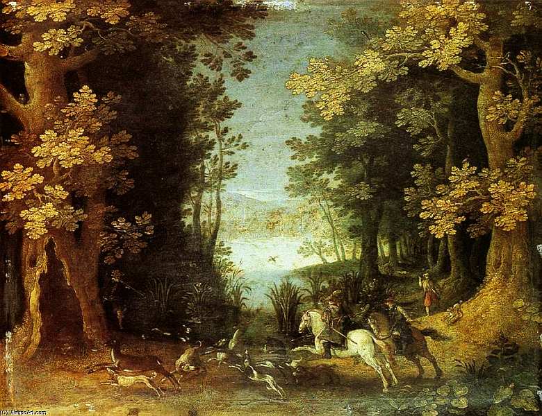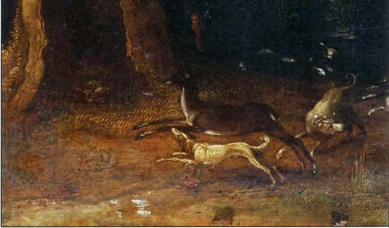 В картине «Охота на оленей» кульминация всего действия тоже разворачивается на фоне живописного пейзажа. На переднем плане двое всадников настигают свою добычу, и охотничьи собаки уже бросаются на нее. Однако зритель не сразу заметит эту почти миниатюрную сценку: гуща леса расступается и соблазнительно открывает вид на озеро. А в глубине, в дымке, просматривается то ли замок, то ли деревня.
