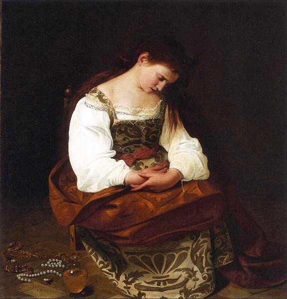 Подлинная человечность Марии Магдалины, грешницы, однажды раскаявшейся и принявшей истинную веру, прощение ее Всевышним, сделали ее одной из самых популярных героинь живописных композиций. Даже знатоки приняли эту картину мастера сурово за то, что религиозный сюжет в ней фактически не просматривается. Кающаяся простолюдинка с распущенными нечесанными волосами в современном художнику платье погружена в глубокую скорбь. То, что перед зрителем – новозаветная Мария Магдалина, можно понять благодаря набору символов – сосуду с ценным маслом и жемчужному ожерелью, знаку земной суетности, пренебрежительно брошенному на пол комнаты. Эффект сочетания почти что жанровой композиции и глубокого христианского смысла, который вполне способен усилить религиозное чувство, был оценен позже. От ранних работ Караваджо распределение света отличается здесь большей сдержанностью и однообразием. Поза и фигура Магдалины перекликаются с положением Марии в композиции «Отдых на пути в Египет».