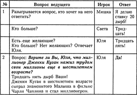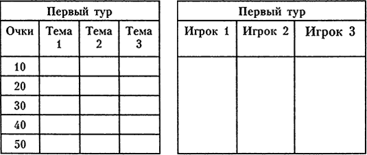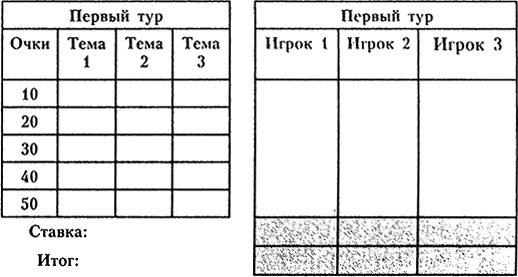 Для игры рисуется таблица вопросов (таблица слева) и ведется протокол ответа (таблица справа), где суммируют (или вычитают при неправильном ответе) очки игроков.