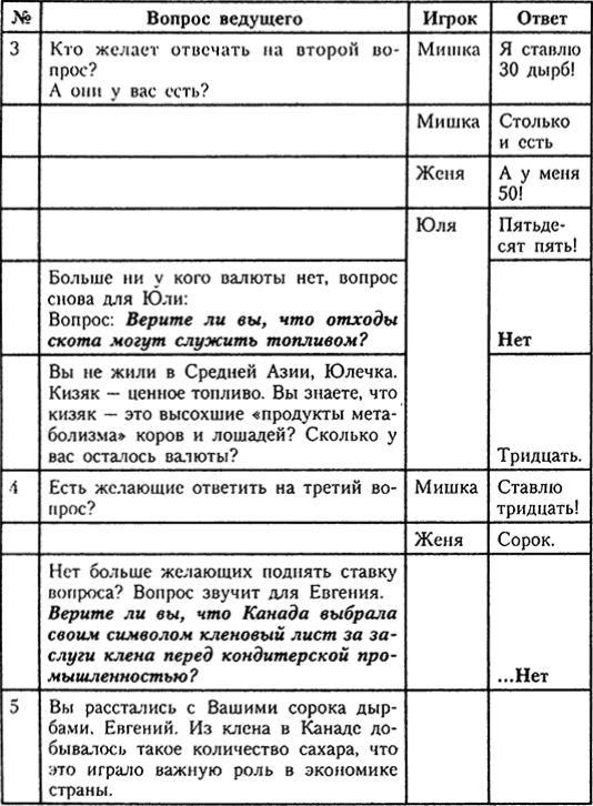 Стратегия этого варианта игры ясна: сначала по подсказке более опытных товарищей отвечают на вопрос более слабые игроки, остаются более сильные. Процессом убывания сотоварищей руководит капитан. Вот она, ответственность! Ответственность не только за честь команды, но и за свое положение и престиж в команде. Ведь открыто приходится показывать, кого ты считаешь слабее себя. Честный капитан «на закуску» оставит не себя, а признанного эрудита-логика.