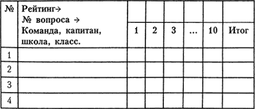 4. Судейская коллегия заносит результаты письменных ответов в протокол, в котором иногда подсчитываются не только очки – количество правильных ответов, но и рейтинг вопроса.