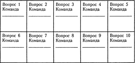 Пример бланка ответа для одной команды (тур из 10 вопросов). Бланки выдаются во время регистрации команды. Им сообщается номер по протоколу, который они заносят в каждый квадратик с номером вопроса. Каждый квадратик перед началом игры разрезается: