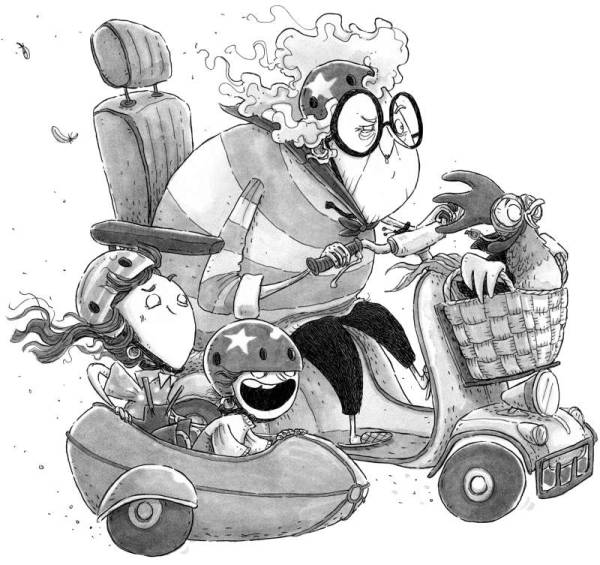 На песчаной дорожке у ворот был припаркован ярко-красный мопед, сконструированный специально для пожилых людей. Петух уселся в висящую спереди металлическую корзину и нацепил защитные очки. Бабушка Агата прикатила из сарая мотоциклетную коляску и быстро привинтила её к мопеду. Лили и Мики с лёгкостью поместились в ней. Все надели на головы шлемы, бабушка Агата завела мотор, и пёстрая компания покатила в центр города.