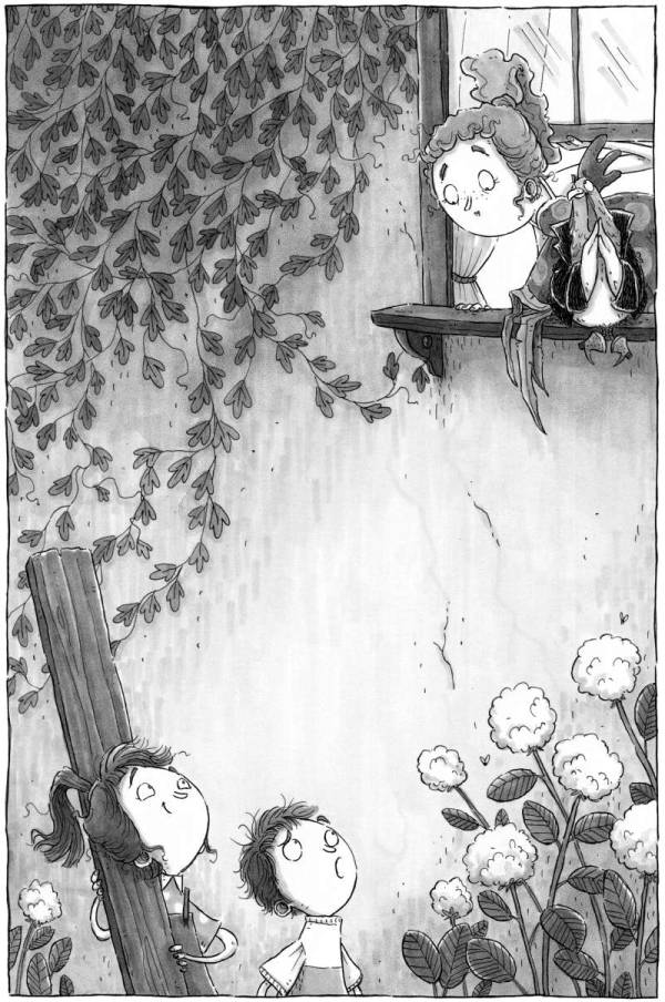 Лили положила бревно на землю и установила поперёк него доску. Педро встал на конец доски и подал девочке знак. Та с разбегу прыгнула на другой конец, петух взлетел в воздух и шмякнулся на карниз второго этажа. Оттуда он смог заглянуть в комнату.
