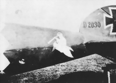 Albatros Ленца из Jasta 14 с персональной эмблемой – ведьмой, летящей верхом на птице и наблюдающей в подзорную трубу за полетом британского истребителя DH 2.