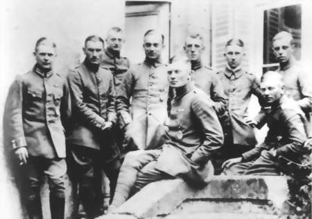 Пилоты Jasta 2. Слева направо: лейтенант Хеемсот (2), Герман Фроммхерц (33), Эрнст Борман (16), Фрайхерр фон Гуденберг, Карл Болле (35 побед, сидит), Фриц Кемпф (4), Минарек, Альфер Линденбергер (14 побед, стоит сзади), Герман Болле.