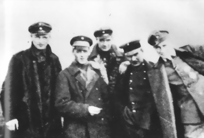 Пилоты из Jasta 18: слева направо: Ганс Фибиг (5), Гуго Шефер (11), «Зеппль» Вельтьенс (35), Пауль Штрэле (15) и лейтенант Клеффель (1).