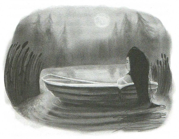 Он направился к лодке, но остановился с тихим восклицанием. Маленькая весельная лодка больше не была пришвартована к краю озера, а вместо этого плавала в центре. В ней сидела женщина, одетая в белое. Она небрежно откинула голову назад, опустив одну руку в воду. Ее волосы цвета воронова крыла рассыпались по корме.