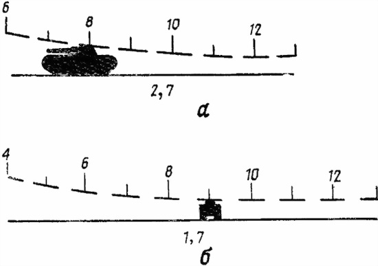 89. Для определения расстояний по дальномерной шкале сетки «КУМ» оптического прицела необходимо навести шкалу на цель так, чтобы цель располагалась между сплошной горизонтальной и наклонной пунктирной линиями (рис. 47, а). Штрих шкалы, расположенный над целью, указывает расстояние до цели, имеющей высоту 2,7 м. Если цель имеет высоту, меньшую (большую) 2,7 м, то необходимо из расстояния, определенного по шкале, вычесть (прибавить) поправку, равную произведению числа десятых метра разницы в высоте цели на постоянное число 4 и на цифру шкалы, расположенную над целью.