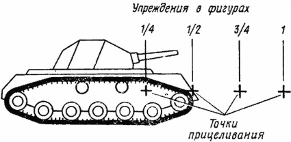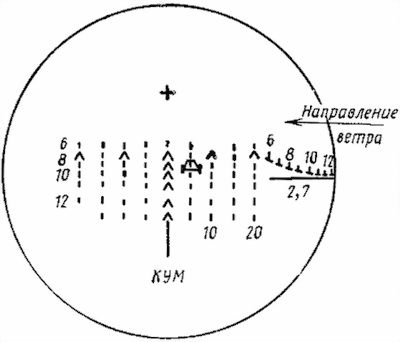 При учете поправки направления выносом точки прицеливания центральная марка выносится на 2,5 фигуры в сторону, куда движется цель, т. е. вправо. Если поправка направления учитывается шкалой боковых поправок, то деление 3,5 этой шкалы выбирается в левой части сетки (наводка должна производиться в середину цели промежутком между третьим и четвертым штрихами).