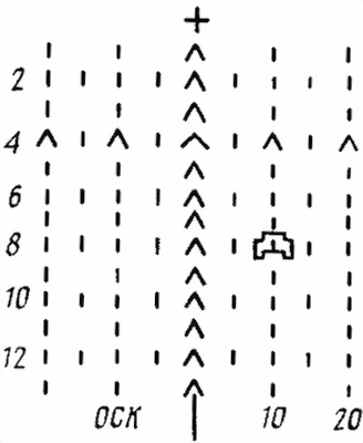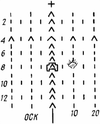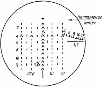 При учете поправки направления выносом точки прицеливания центральная марка выносится на 2 фигуры в сторону, куда движется цель, т. е. влево. Если поправка направления учитывается шкалой боковых поправок, то деление 3,5 этой шкалы выбирается в правой части сетки (наводка должна производиться в середину цели промежутком между третьим и четвертым штрихами).
