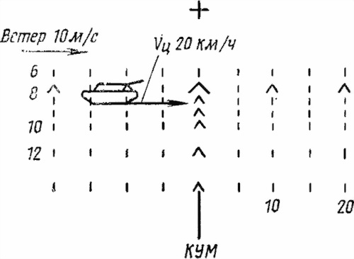 Рис. 52. Наводка при стрельбе из гранатомета кумулятивной гранатой по движущейся цели при сильном боковом ветре: