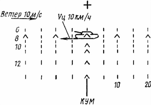 Пример 2. Определить суммарную поправку, если танк движется справа со скоростью 10 км/ч на расстоянии 800 м и ветер сильный слева (рис. 52, б).
