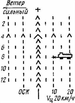 Рис. 53. Наводка при стрельбе из гранатомета осколочной гранатой прямой наводкой по движущейся цели при сильном боковом ветре: