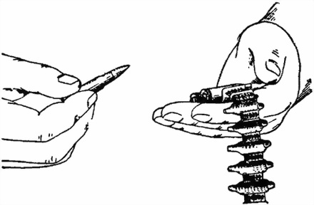79. Для снаряжения ленты нужно положить ее на ладонь левой руки наконечником к себе, ограничительными выступами вправо и придерживать большим пальцем. В правую руку взять патроны и вставлять их в звенья ленты так, чтобы ограничительный выступ вошел в кольцевую проточку патрона (рис. 35).