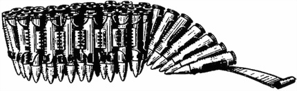80. Свернуть ленту с патронами (рис. 36) и уложить ее в коробку пулями вниз. Наконечник ленты вывести из окна коробки.
