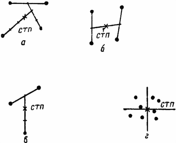 Среднюю точку попадания можно определить также следующим способом: соединить пробоины попарно, затем соединить середины обеих прямых и полученную линию разделить пополам точка деления и будет средней точкой попадания (рис. 37, б).