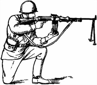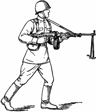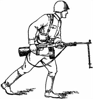 Для стрельбы на ходу пулеметчик перекидывает ремень через левое плечо и удерживает пулемет правой рукой за пистолетную рукоятку, левой – за цевье.