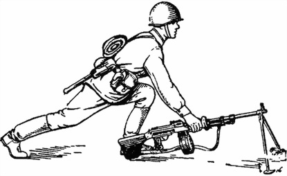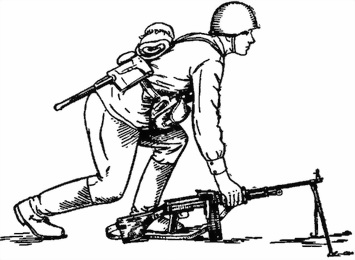 105. В зависимости от характера местности в наличия укрытий пулеметчик выдвигается на огневую позицию перебежками или переползанием. При этом коробка с лентой должна быть присоединена к пулемету; сошка при перебежке – разведена, а при переползании – сложена. При перебежке пулемет держать одной или двумя руками, как удобнее (рис. 38). Если до смены огневой позиции велась стрельба, то при выдвижении на следующую огневую позицию пулемет можно не разряжать, но обязательно поставить на предохранитель.
