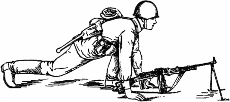 104. Для занятия огневой позиции и изготовки к стрельбе подается команда, примерно: «Ручному пулемету, огневая позиция там-то – к бою». По этой команде пулеметчик занимает огневую позицию, ложится, применяясь к местности, и изготавливается к стрельбе.