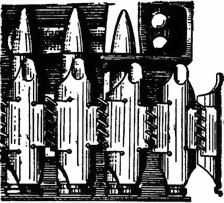 – правой рукой продернуть ленту вправо до отказа, чтобы направляющие выступы звеньев проходили над отсекателем и первый патрон поставить против продольного окна основания приемника (рис. 43);