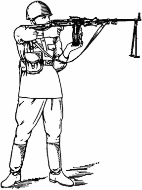 111. Для изготовки к стрельбе стоя надо повернуться вполоборота направо по отношению к направлению на цель и, не приставляя левой ноги, отставить ее влево примерно на ширину плеч, как удобнее пулеметчику, распределив при этом тяжесть тела равномерно на обе ноги. Взять пулемет левой рукой за цевье, а правой – за пистолетную рукоятку.