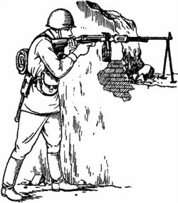 131. Для стрельбы без остановки необходимо правой рукой прижать приклад к правому боку и, продолжая движение, направить пулемет в цель и открыть огонь (рис. 53).