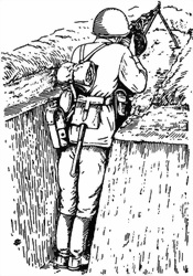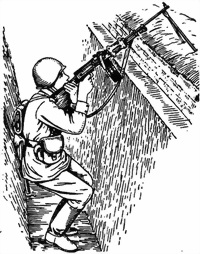 128. Для стрельбы из окопа или траншеи прислониться корпусом к стенке окопа, локти обеих рук упереть в землю и приложиться с упором приклада в плечо (рис. 51).