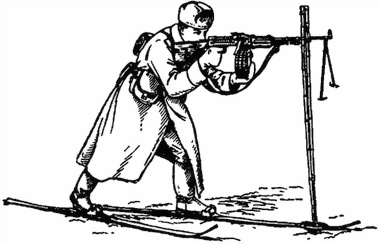 Рис. 58. Стрельба с лыж стоя с использованием палок в качестве упора