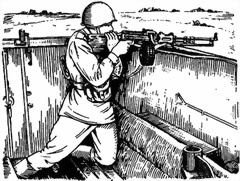Стоя с установкой сошки пулемета на бруствер (берму) траншеи (рис. 63). Пулемет, установленный сошкой на бруствер (берму) траншеи, удерживается правой рукой за пистолетную рукоятку, левой – за шейку приклада. Для придания пулемету необходимого угла возвышения пулеметчик приседает или приподнимается. Изменение направления пулемета при стрельбе достигается перемещением корпуса пулеметчика в нужную сторону.