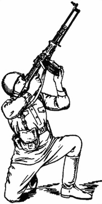 а) при стрельбе с колена поставить пулемет на сошку, встать на правое колено и сесть на голень ноги, вставить приклад в плечо, упереть локоть левой руки в левую ногу;