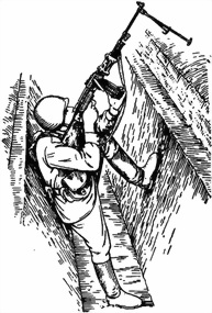 С опорой спиной и левой ногой о крутости траншеи (рис. 64). Приподнять левую ногу как можно выше и упереть ее ступней в переднюю крутость траншеи, а спиной опереться о тыльную крутость траншеи и слегка присесть. Пулемет удерживать правой рукой за пистолетную рукоятку, левой – за коробку. Положение локтей такое же, как и при изготовке к стрельбе с колена. При стрельбе изменение направления пулемета достигается поворотом корпуса пулеметчика, изменение угла возвышения – сгибанием и разгибанием корпуса и правой ноги.
