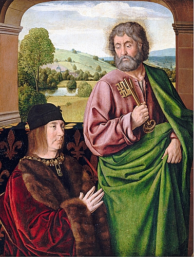 Жан Эй, Пьер II Бурбонский и Святой Петр, левая панель Евхаристического триптиха, ок. 1492–1493, масло по дереву (дуб), 84 × 77 см, Париж, Музей Лувра, Отдел живописи, инв. 9071.