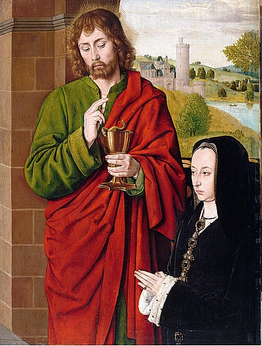 Жан Эй, Анна Французская и святой Иоанн Евангелист, правая панель Евхаристического триптиха, ок. 1492–1493, масло по дереву (дуб), 73 см × 53 см, Париж, Музей Лувра, Отдел живописи, инв. RF 535.