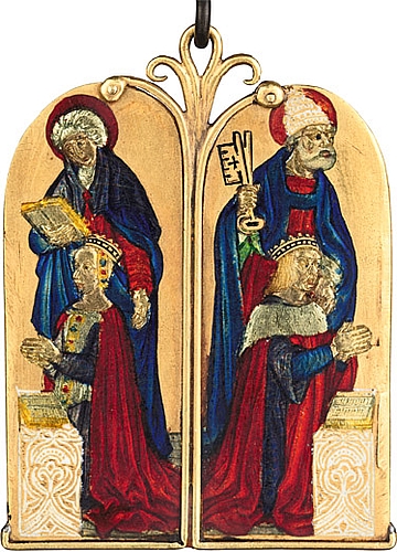 Неизвестный автор, принцесса Анна и Пьер Бурбонский со Святой Анной и Святым Петром (лицевая сторона), ок. 1500 г., золото на полупрозрачной эмали, 4,5 см × 3,7 см, Лондон, Коллекция Уоллеса, инв. W34. На оборотной стороне изображены знаменитые предки супругов Карл Великий и Людовик IX Святого.