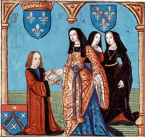 Симфорьен Шампье, Неф добродетельных дам, сцена преподнесения книги принцессе Анне, BnF, RLR, Vélins 1972. Эта миниатюра сопровождалась следующей надписью: "Здесь начинается небольшая книга под названием Неф добродетельных дам, написанная метром Симфорьеном Шампье, посвященная и преподнесенная благороднейшей и добродетельнейшей даме принцессе Анне, герцогине Бурбонской и Оверньской".