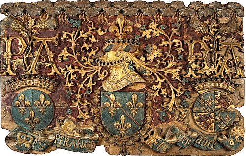 Барельеф с гербом Бурбонов, между 1488 и 1503 годами, орех или фруктовое дерево, полихром и позолота, 58 см × 92,5 см × 3,5 см, Мулен, Музей Анны де Божё, инв. 95.112.1.