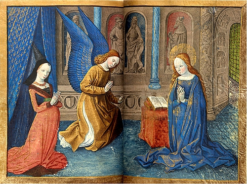 Horae ad usum Romanum, известные как Часослов Анны Французской, принцесса Анна за молитвой, ок. 1473 г., миниатюра Жана Коломба, Нью-Йорк, Библиотека и музей Моргана, ms. M. 677, лист 42v°-43r°.