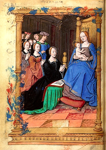 Psalmi poenitentiales, принцесса Анна со свитой в молитве перед Богородицей и младенцем Иисусом, миниатюра Жана Пишора, после 1503 г., Париж, BnF, ms. Latin 3637, fol. 1r°-2°.