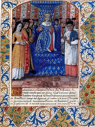 Ордонанс Карла VIII о управление королевством в связи с его отъездом в Италию, король изображен в окружении четы герцогов Бурбонских и представителей трех сословий королевства, ок. 1494–1495 г., BnF, ms. Français 5743, fol. 1.