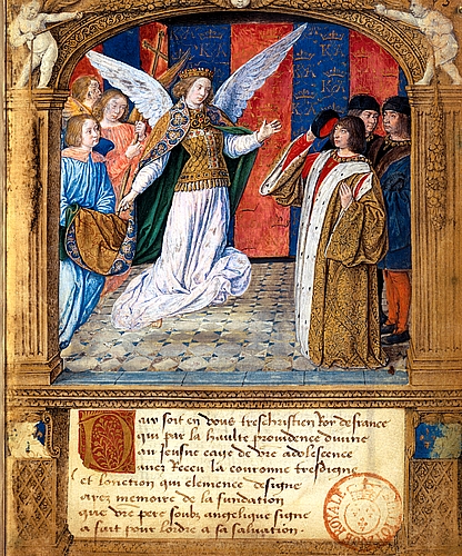 Устав Ордена Святого Михаила, Карл VIII и Пьер II Бурбонский перед Святым Михаилом, миниатюра Жана Эйя, ок. 1493–1494, BnF, ms. Français 14363, fol. 3.